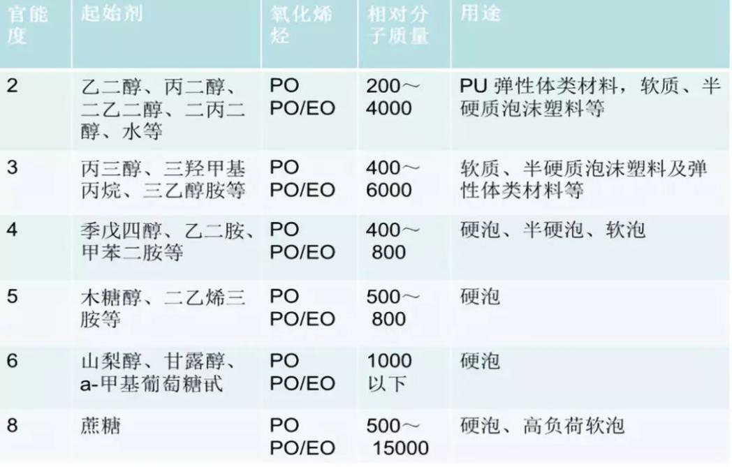 聚醚多元醇的品種很多,側(cè)重不同,則分類不同。一般聚醚多元醇的命名以主鏈上羥基數(shù)與單元鏈節(jié)性質(zhì)相結(jié)合的命名較為合理,下圖是用不同起始劑得到的不同聚醚多元醇產(chǎn)品。