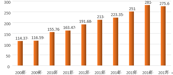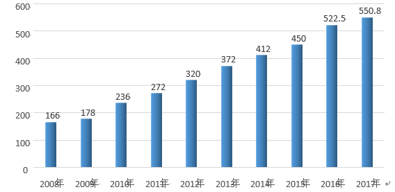 (2008年到2017年國(guó)內(nèi)聚醚多元醇產(chǎn)能統(tǒng)計(jì),單位萬噸)